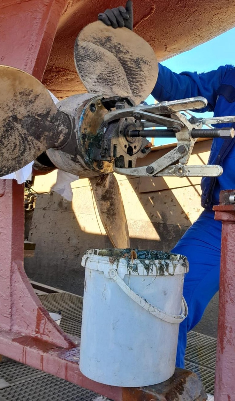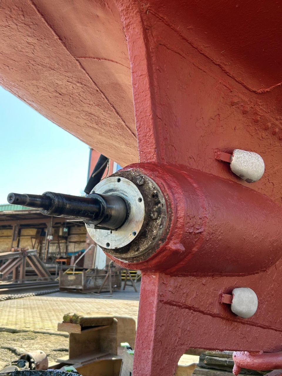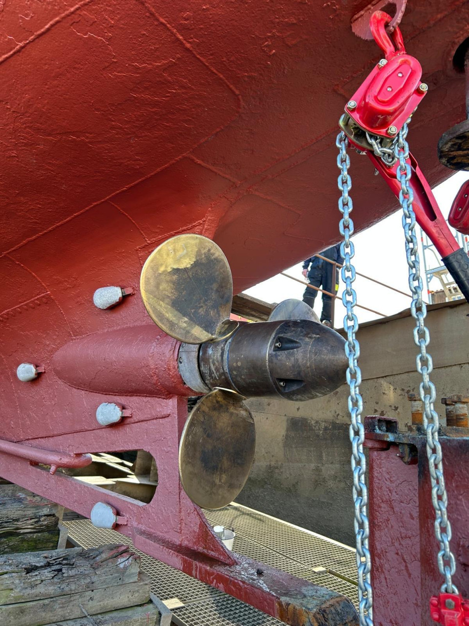Am 7.4.2026 hat die Firma Piening aus Glückstadt während des Werftaufenthalts den Propeller gegen den bei der Fa. Piening eingelagerten generalüberholten Propeller ausgetauscht.